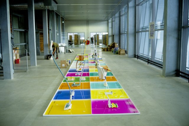 een presentatie van dertig geselecteerde hema-ontwerpen voor schoonmaakgereedschap A clean house is a fresh house, and a fresh house is a clean smelling house. And a clean smell, well... this can only be produced by cleaning agents. This presentation of 30 entries for the Hema Design Competition smells clean like hell. The objects are presented over flat perspex tanks each filled with a different cleaning agent, and thus their prolific coloring, and their prolific smells: lemon, pine, dandelion, roses, apples and what more. |