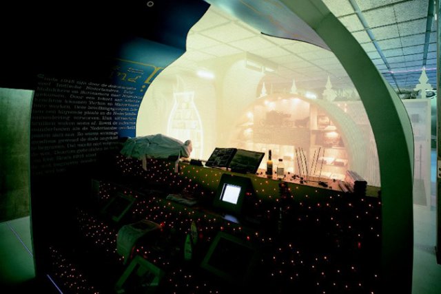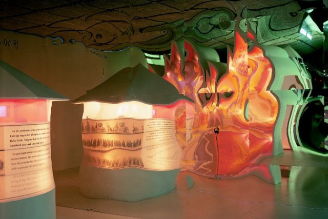 een tentoonstelling over de doodsrituelen, zoals deze de voor de inrichting werd een zwarte doos ontworpen, waarin een reeks mausoleumachtige ruimtelijke symbolen stonden, die samen met de bezoekers oneindig werden herhaald door twee spiegels. |