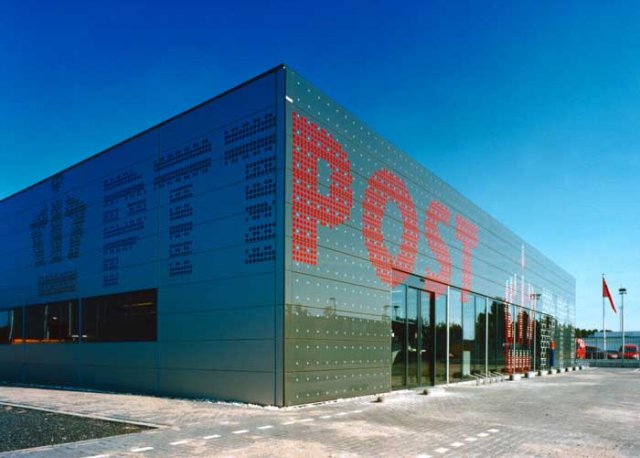 Seriële architectuur-signalisatie voor keten van distributiecentra (gerealiseerd bij ± 30 vestigingen in Nederland). Visueel onderzoek naar een systematische benadering van Bestelkantoren met verschillende gebruikers leidde tot de ontwikkeling van een onderbroken 9 x 9 stipmatrix van retro-reflecterende prismatische folie. Op deze wijze konden de logo’s van de verschillende gebruikers als gelijkwaardig onderdeel worden toegepast op de façade. Uiteindelijk werd PTT Post de enige gebruiker. Er zijn ruim 30 bestelkantoren volgens deze methodiek gerealiseerd. |