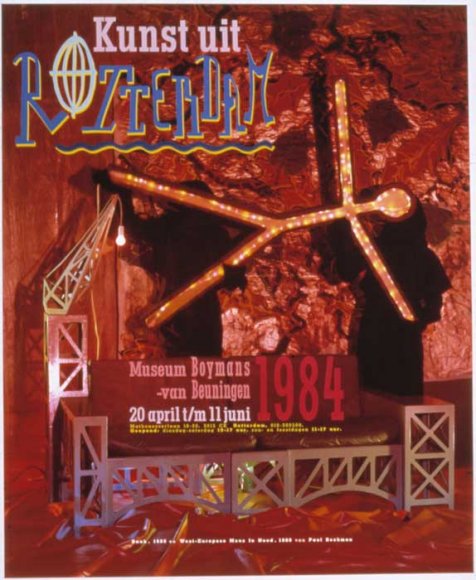 Het object wat door de twee schimmen wordt getorst boven de ’haven bank’ heet West Europese Mens in Nood. Beide zijn werken van Paul Beckman. De titel van de mens in Nood is verzonnen door de Schrijver gerard Reve, een goede vriend van Paul, als antwoord op de vraag "...wat dit nu eigenlijk voorstelde..." ...De Schiedamse beeldend kunstenaar Paul Beckman ... zou je een ongrijpbare timmerman kunnen noemen, een kunstenaar, vermomd als meubelmaker. Hij laat meubels na, foto’s, sculpturen en tekeningen. Jarenlang lag er bij het Centraal Station in Rotterdam een stalen beeld - lelies, afgeleid van de Japanse papiervouwkunst en getint in de kleuren van de tram - dat er verdwaald leek. Beckman liet zich niet vangen door een stijl of een discipline. Hij kreeg een idee, op reis of op straat, maakte een ontwerp, timmerde het eigenhandig in elkaar en verkocht het dan meteen voor een te lage prijs. Misschien zag hij in het Rijksmuseum in Amsterdam het kantwerk, dat in uitvergrote structuur in een houten kamerscherm terecht kwam, en straks een van zijn laatste opdrachten siert, een metalen wand op een plein in Schiedam. ,,Het praktische zit erin gebakken’’, zei hij over zijn werk... ....Reve illustreerde dit met een waarschijnlijk verzonnen en in ieder geval sterk overdreven relaas over de tentoonstelling van een aantal meubels van Beckman in het museum Boijmans Van Beuningen. De bezoekers konden volgens hem niet van de tafels en stoelen afblijven: ‘toen suppoost heel even weg was voor zijn toch welverdiende kop koffie, gaven een jongeling van het manlijk en een meisje van het vrouwelijk geslacht zich in het door Paul, in diens zin voor gastvrijheid, van beddengoed voorziene en keurig opgemaakte bed, teneinde hun natuurlijke wil m et elkaar te doen.’ Dat leidde hem tot de conclusie: ‘Als een kunstenaar mensen aan het lachen kan brengen, dan is dat reeds iets groots; als hij bij mensen tranen te voorschijn kan roepen, dan is dat bijna het hoogste wat een kunstenaar kan bereiken; maar als hij er in slaagt, het zojuist oor mij omschreven sacrament zich te doen voltrekken, dan heeft hij niet te vergeefs gearbeid, en heeft hij niet voor niets geleefd. Proficiat, Paul Beckman! Moge God Uw werk blijven zegenen!’... |
